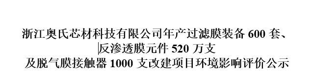 浙江奧氏芯材科技有限公司年產過濾膜裝備600套、反滲透膜元件520萬支及脫氣膜接觸器1000支改建項目環境影響評價公示根據《浙江省建設項目環境保護管理辦法》相關...